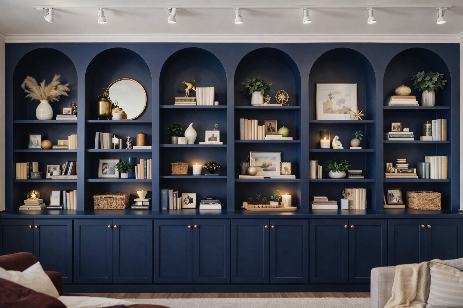 Custom built ins bookcase designed with open shelving to highlight books, dรฉcor, and personal collections.
