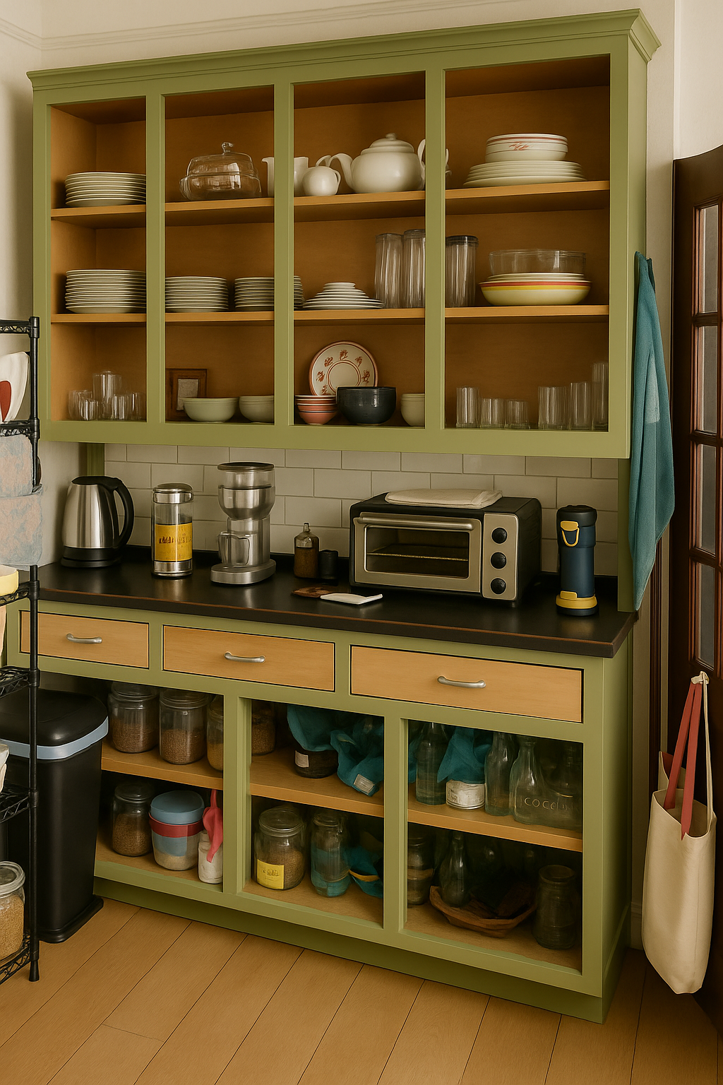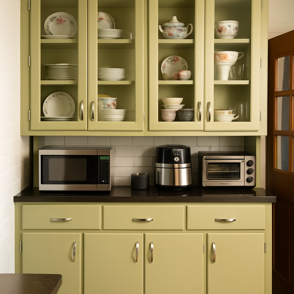 The final reveal is nothing short of stunning. The combination of Artesia glass-front doors and Valencia slab drawers creates visual balance, while the olive green hue gives the space a sophisticated, cohesive look. The updated hardware adds polish without overpowering the design, and the glass inserts provide a glimpse of her curated dishware and vintage pieces.