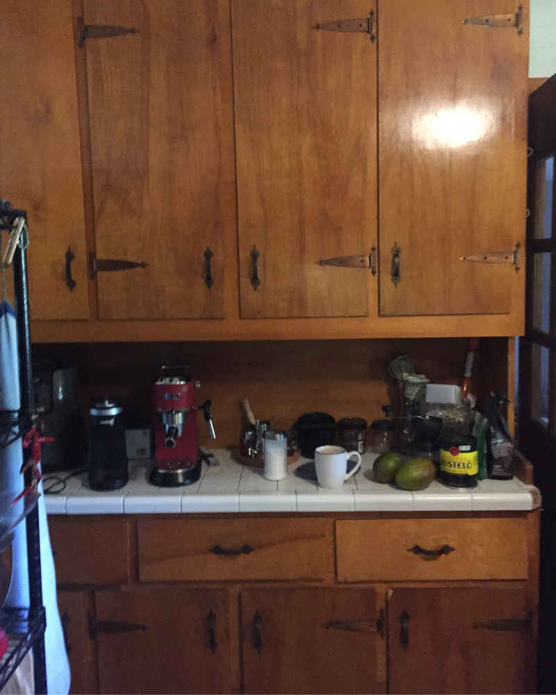 Amy’s original kitchen was filled with natural wood cabinetry and classic hardware — solid and sturdy, but showing its age. The traditional doors with large iron hinges and dark finishes made the space feel closed in and dated.