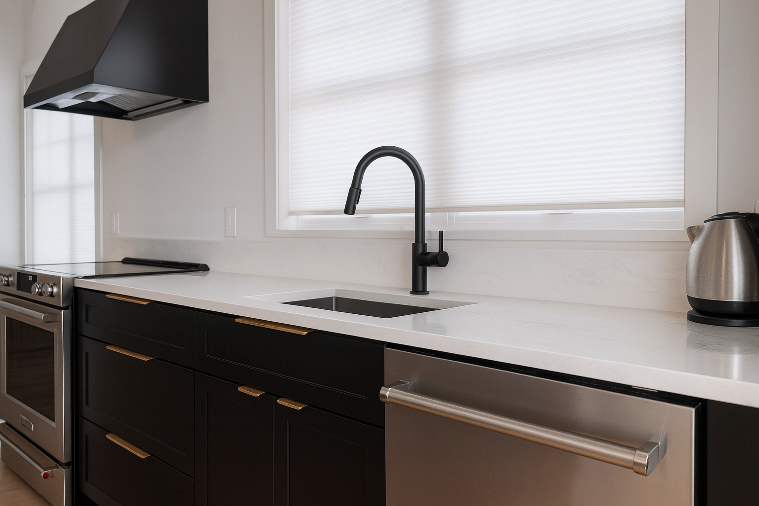 The Modern Shaker Thermofoil doors created a striking visual foundation against the bright natural light. The combination of dark cabinetry and white walls gives the kitchen depth and dimension, while the matte finish absorbs light softly, avoiding glare.