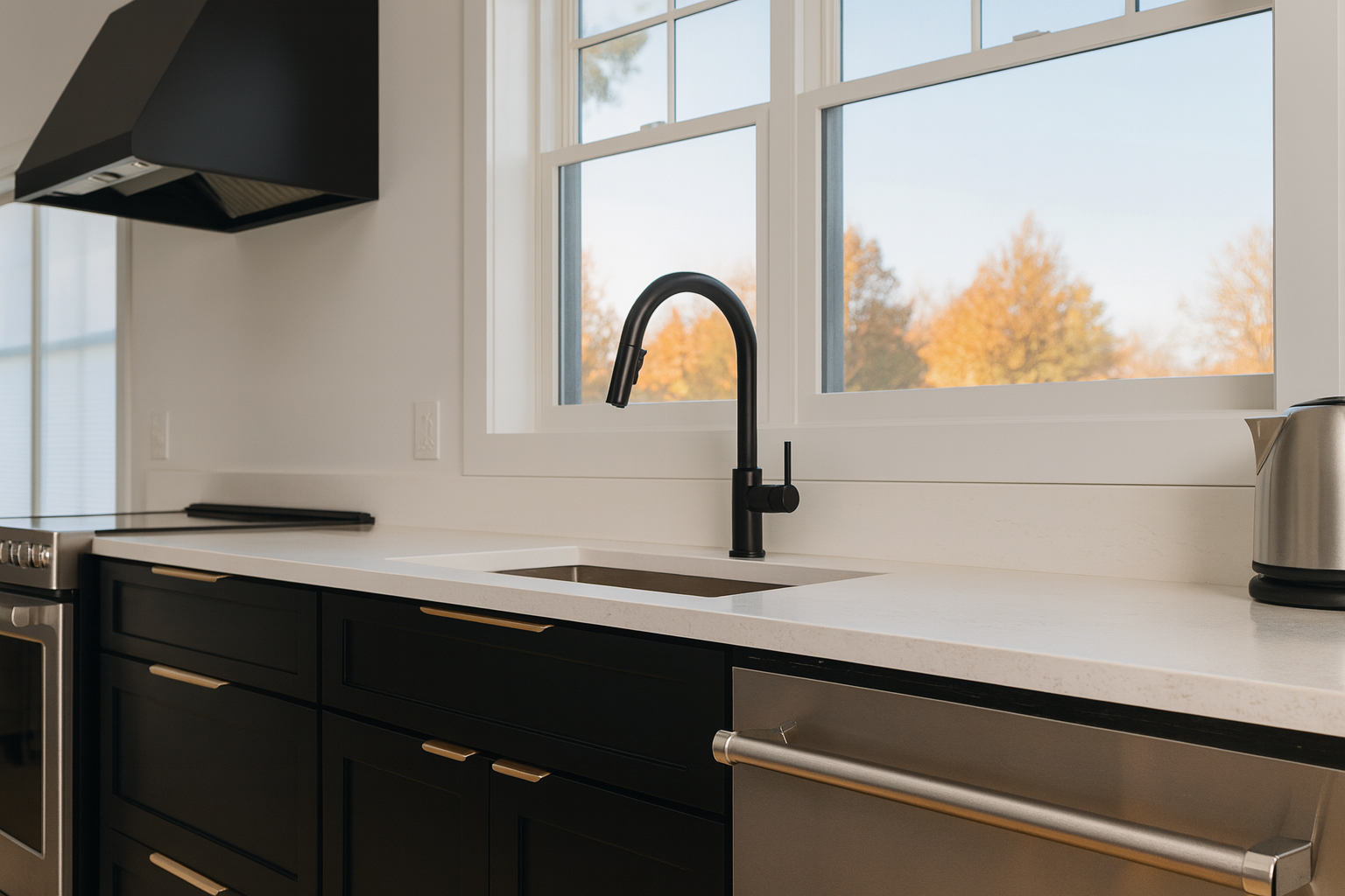 Dark cabinetry like Satin Black adds modern contrast while remaining classic. It pairs beautifully with light countertops and brass hardware, creating depth and balance in any size kitchen.