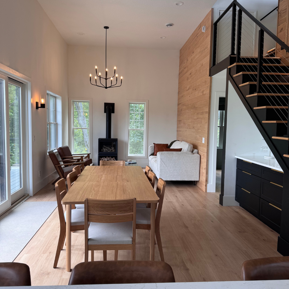 When Mary Jo began planning her new home, she knew the kitchen would be the heart of the project — but it also came with some serious design constraints. The layout was compact, featuring soaring ceilings, a wall of windows, and a staircase cutting into usable space. She needed a kitchen that felt open and modern, but also functional and storage-efficient.